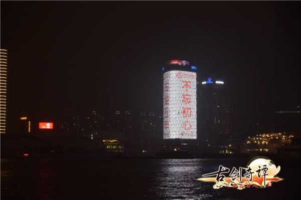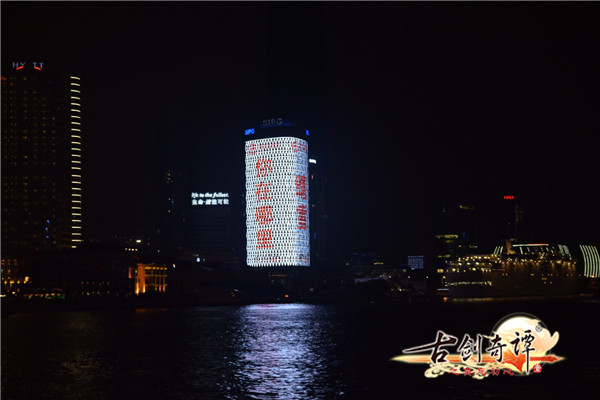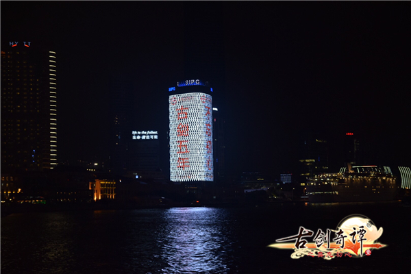 11月23日晚8点,位于上海外滩的SIPG大厦楼体巨幕广告屏突然亮起了《古剑奇谭》手游的宣传广告。整个大厦通体高亮,上面打出“晴雪,你在哪里?”、“巽芳,你在哪里?”、“襄铃,你在哪里?”、“古剑五年,不忘初心”以及游戏LOGO的大幅广告语,形成了一张张巨大的“邀请函”,邀请玩家进入游戏世界共续“古剑梦”。高耸的光柱矗立在黄浦江畔,引众多路人驻足围观,俨然成为外滩一处突如其来的盛景。