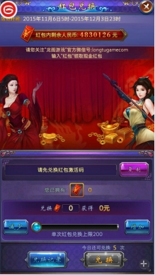 3、玩家获取红包后,在首页的“红包兑换”界面可查看到,在此可提取红包兑换码。每次最多提取200元,每天最多提取5次。先选择获取到的红包数量,然后选择兑换,即可出现红包兑换码。