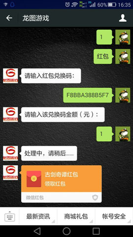 4、关注“龙图游戏”微信公众号,输入【兑换红包】,根据提示输入红包兑换码及相应金额,即可领取微信红包。