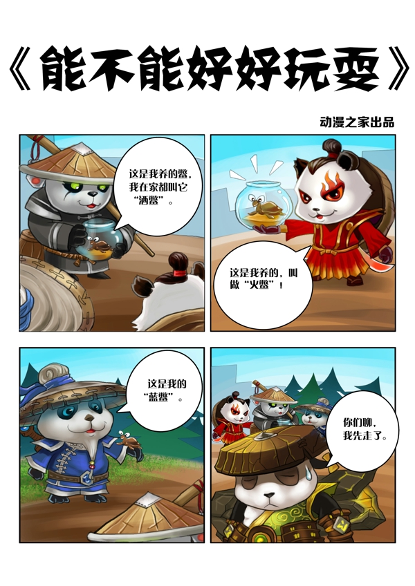 听闻大地之灵即将登陆《小冰冰传奇》,熊猫家族的其他三位兄弟兴致勃勃来跟大地之灵相聚,相聚之余,不忘介绍各自的宠物,酒仙的宠物——“酒鳖”霸气亮相,灰烬之灵也毫不示弱,拿出自己的“火鳖”,风暴之灵的“蓝鳖”也闪亮登场,大地之灵看看自己手中的小“土鳖”,选择悄悄回家......