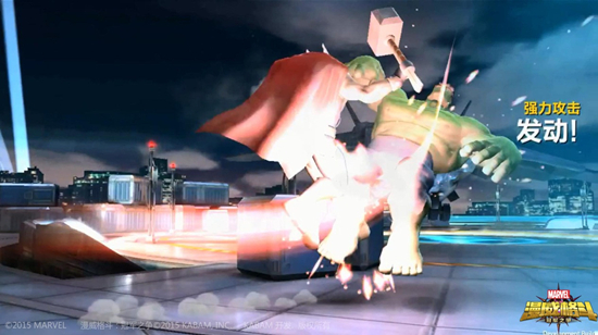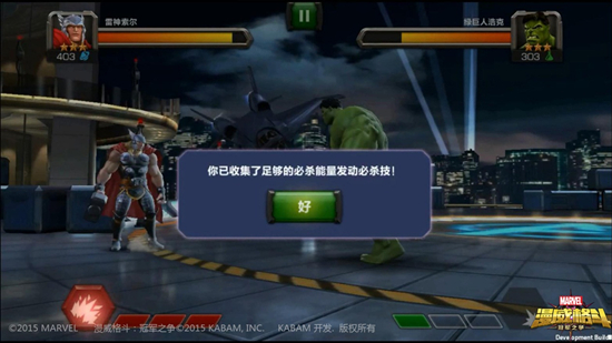 是时候给大家展示一下英雄们的大招了。《漫威格斗》中的必杀技要通过能量的积累,攒满后必杀技图标会点亮,点击必杀技图标来进行释放。