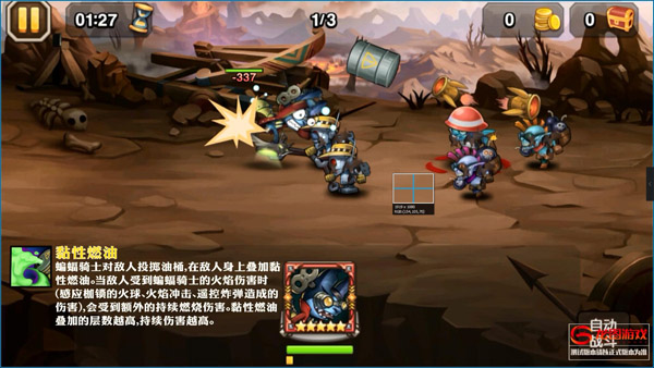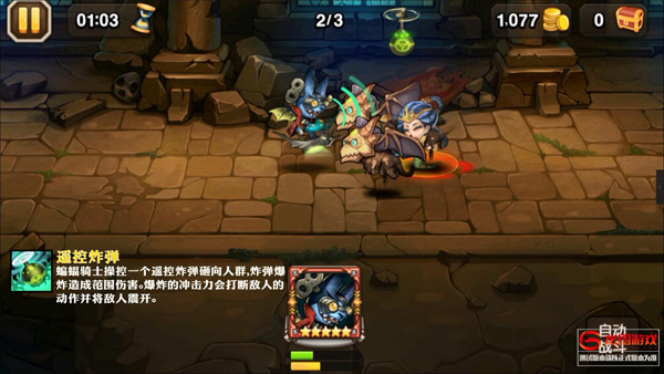 蝙蝠骑士开始高空飞行,获得闪避值提升的效果。首先冲进敌阵,对随机敌人释放火球造成伤害。随后开始返航,在返航过程中会控制住一个敌人并将其拖回出发点面前。敌人被放下后会受到额外晕眩效果。