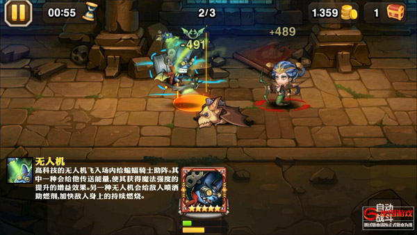 高科技的无人机飞入场内给蝙蝠骑士助阵。其中一种会给他传送能量,使其获得魔法强度的提升的增益效果。另一种无人机会给敌人喷洒助燃剂,加快敌人身上的持续燃烧。