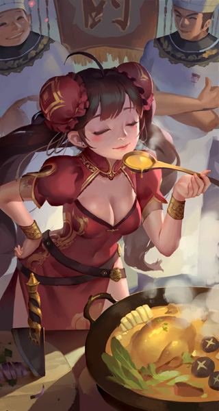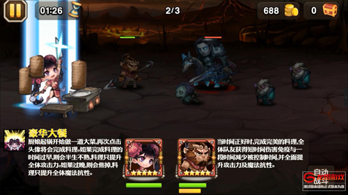 豪华大餐:厨娘起锅开始做一道大菜,再次点击头像将会完成料理。如果完成料理的时间过早,则会半生不熟,料理只提升全体攻击力。如果过晚,则会焦掉,料理只提升全体魔法抗性。当时间正好时,完成完美的料理,全体队友获得短时间伤害免疫与一段时间减少被控制时间,并全面提升攻击力及魔法抗性。