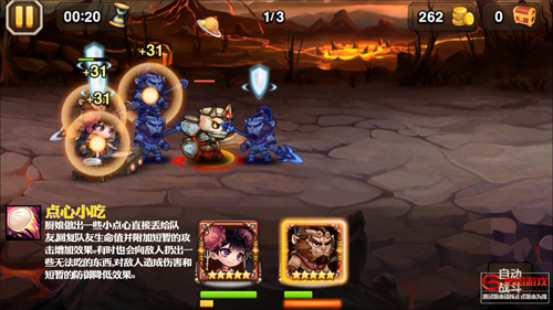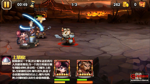 点心小吃:厨娘做出一些小点心直接丢给队友,回复队友生命值并附加短暂的攻击增加效果。有时也会向敌人扔出一些无法吃的东西,对敌人造成伤害和短暂的防御降低效果。